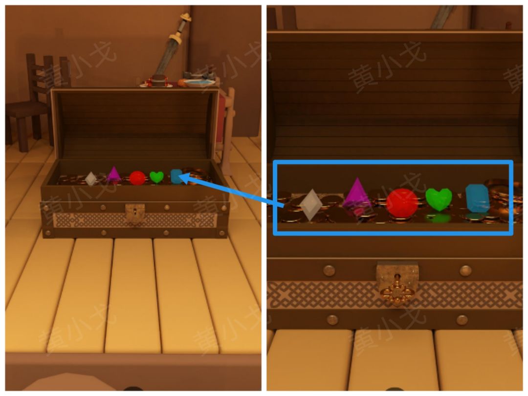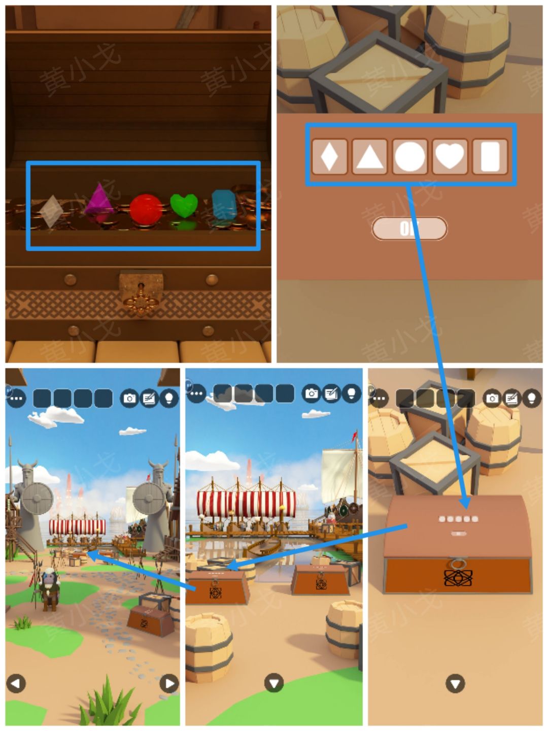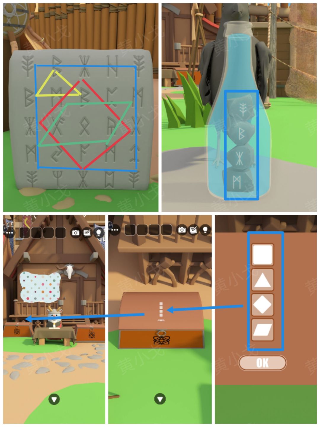 22.点击木桥左侧箱子上的密码锁,根据[图腾-屋子]场景宝石形状线索,调整密码锁