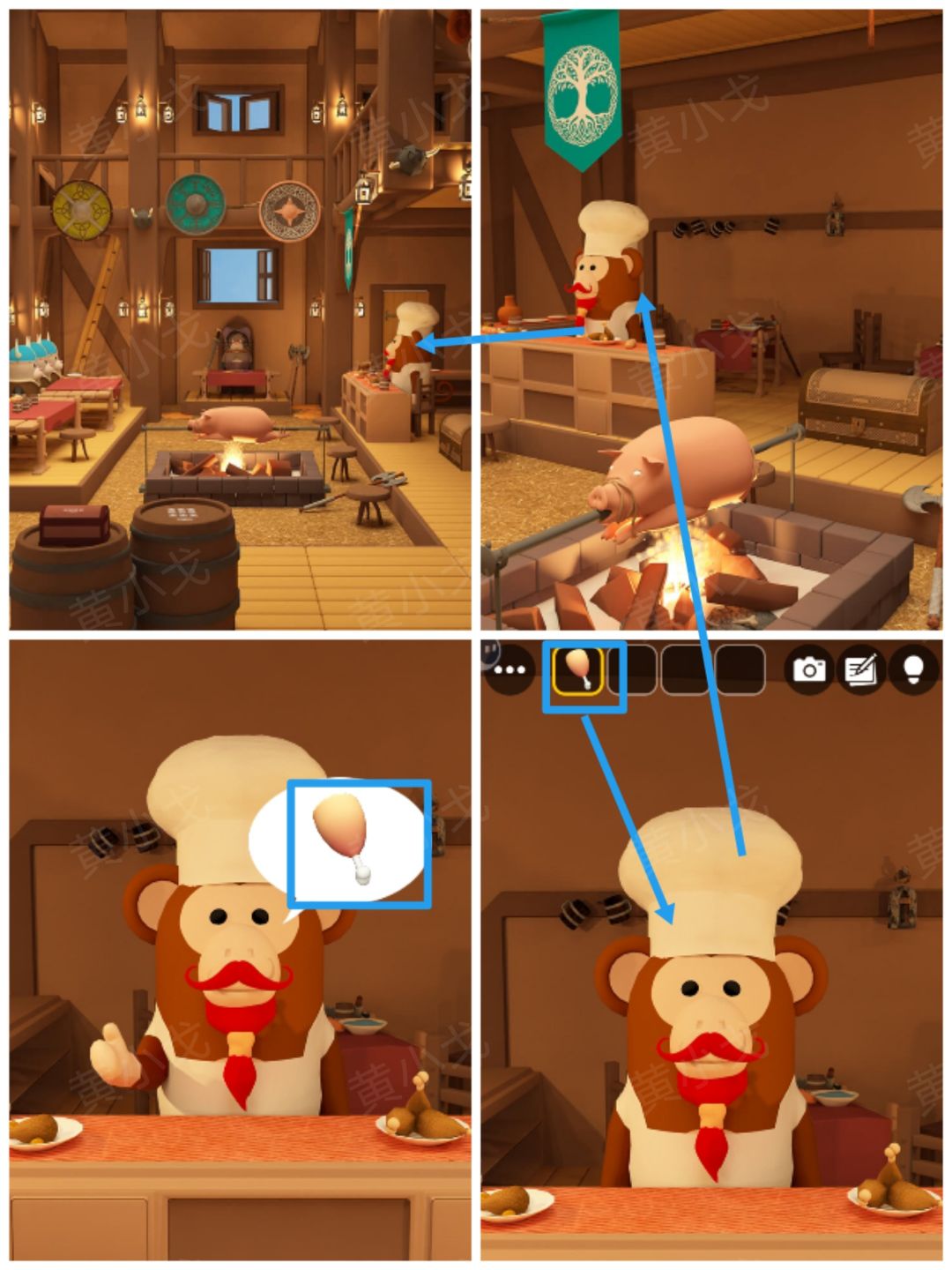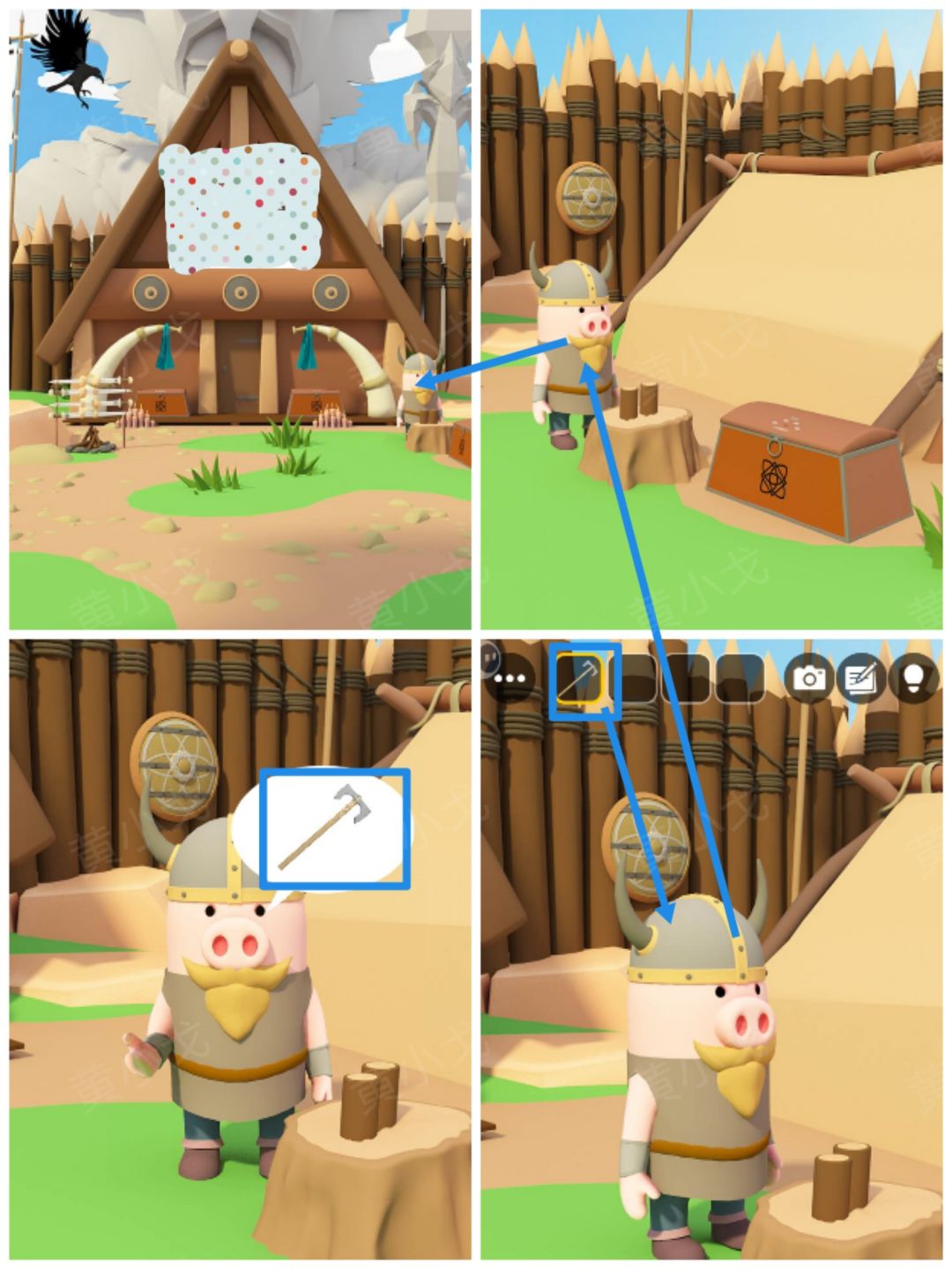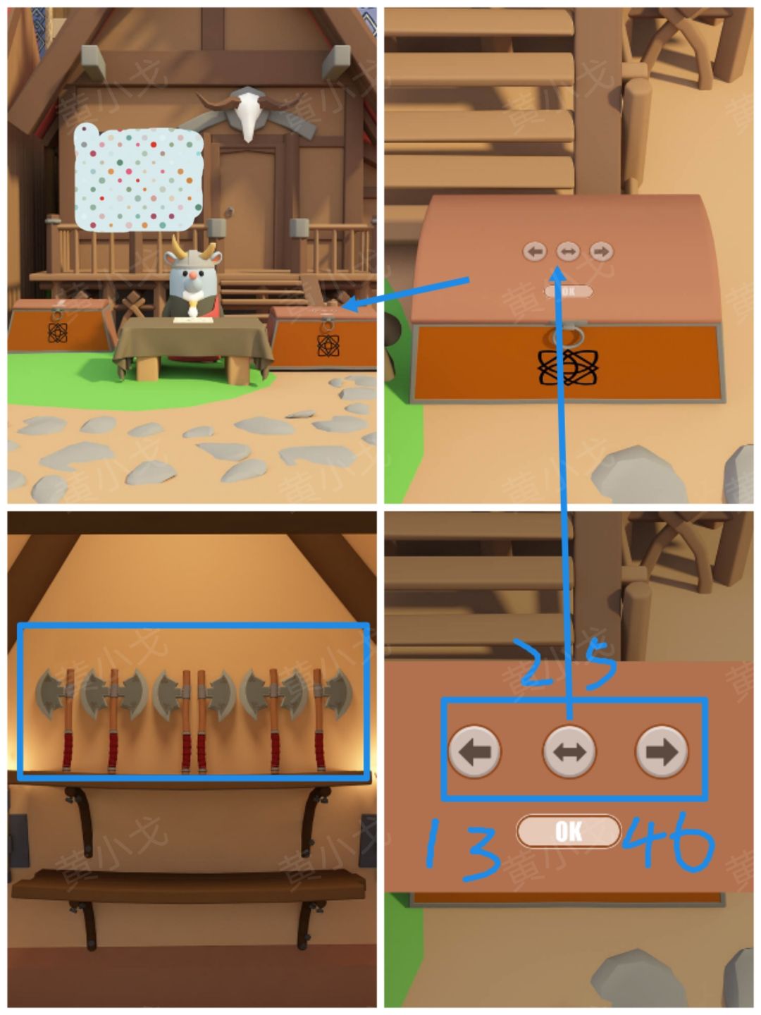 1.点击老鼠右侧箱子上的密码锁,根据[帐篷]场景斧头朝向线索,按顺序按下按钮