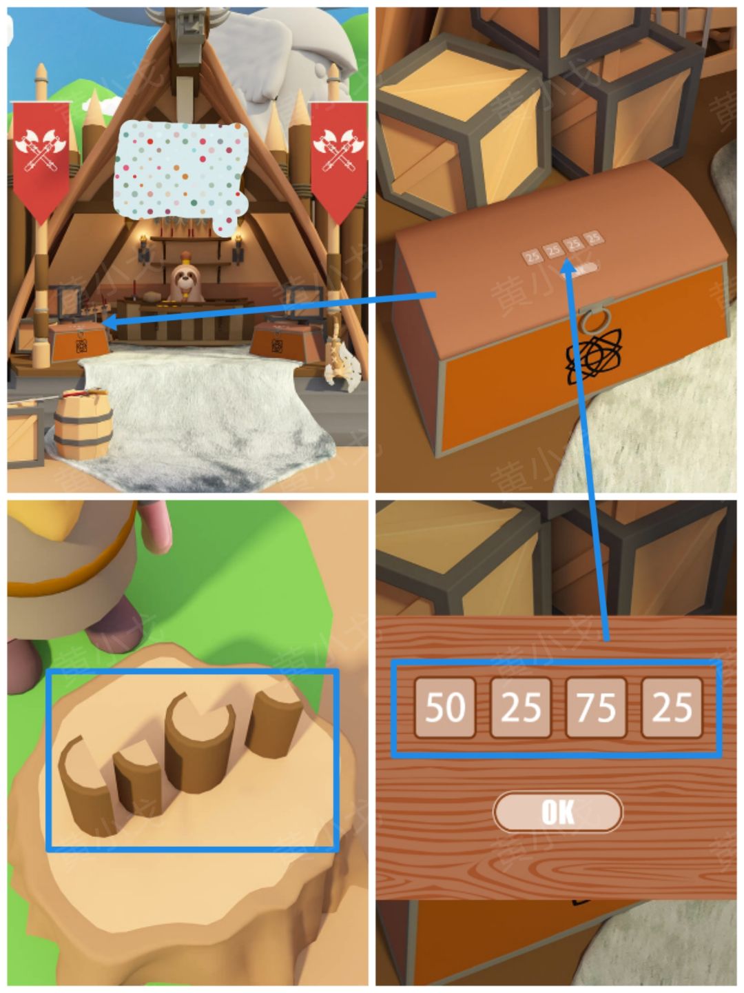 5.点击帐篷里的左侧箱子上的密码锁,根据[图腾]场景小猪劈好的柴线索,输入密码:50,25,75,25