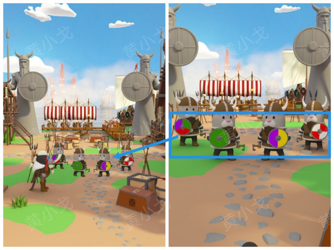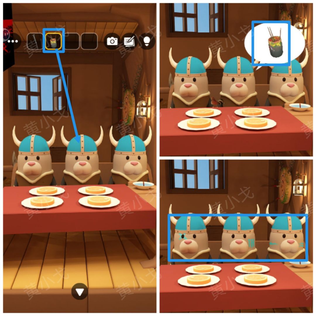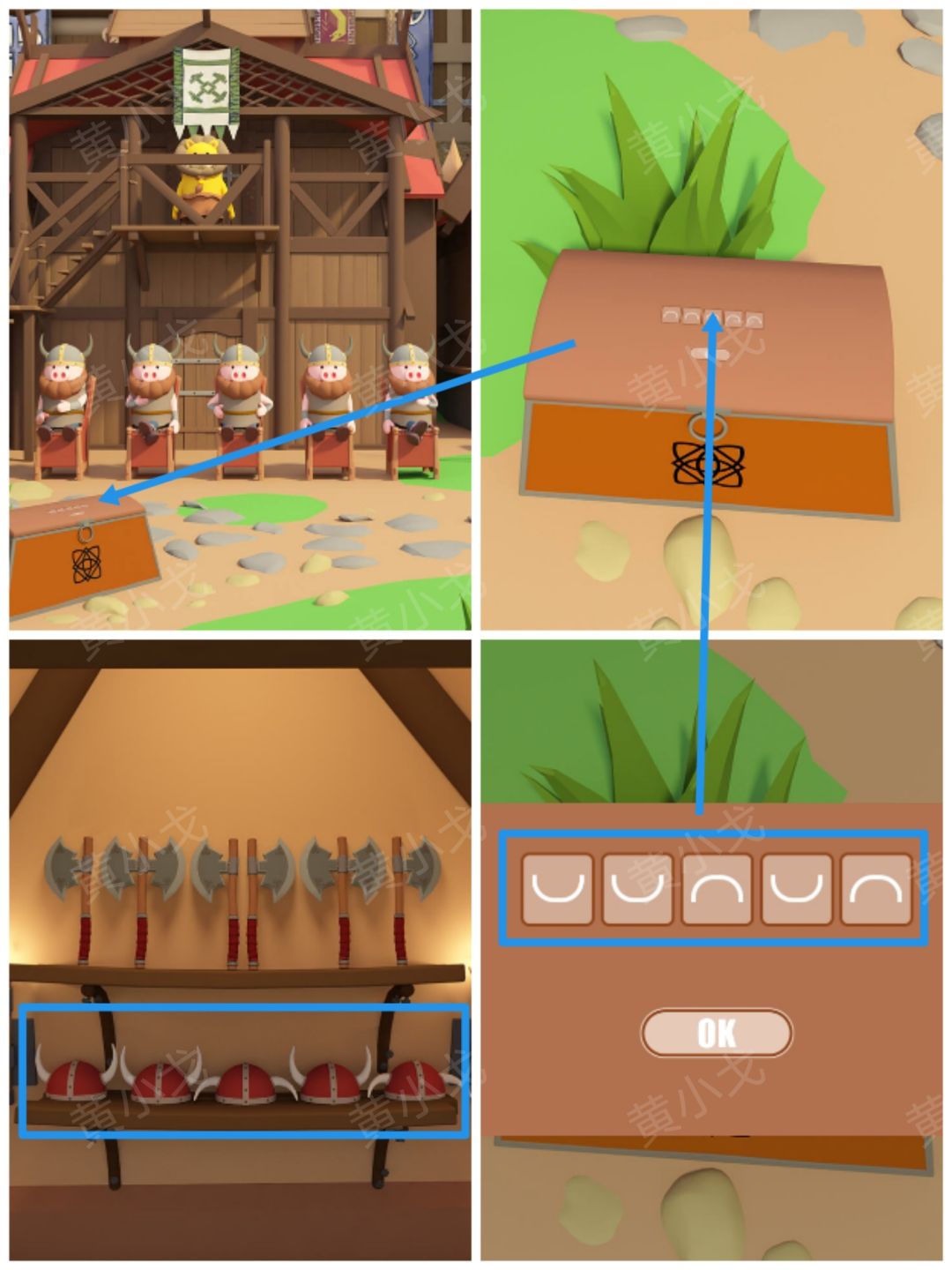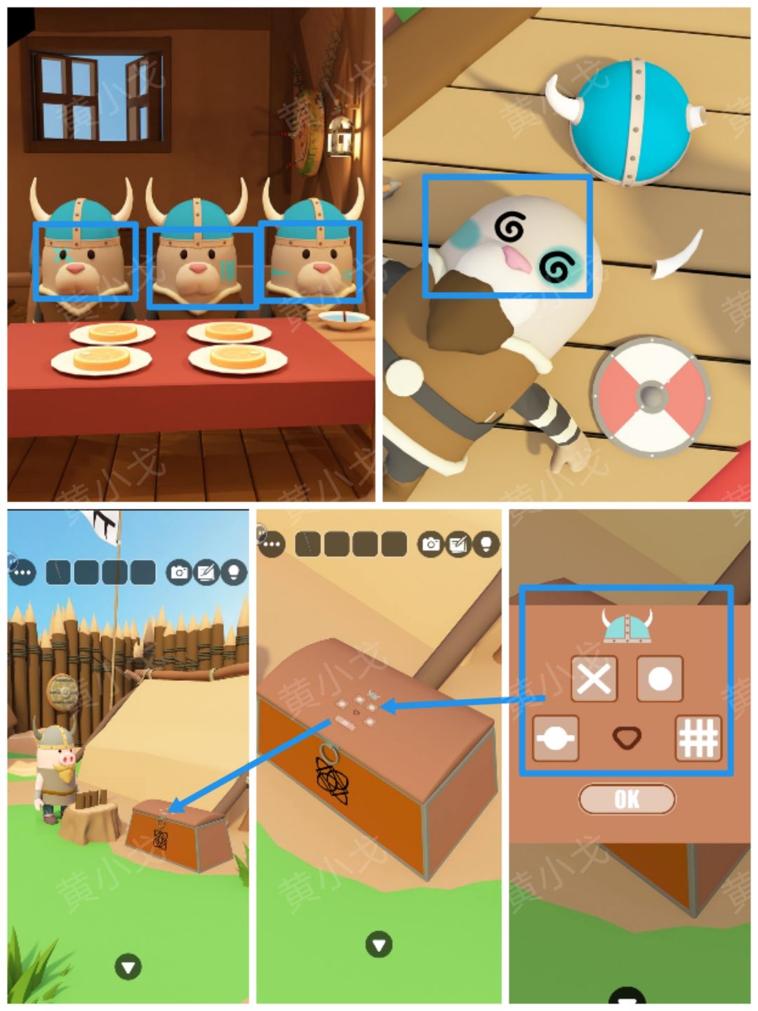 6.点击小猪旁边的箱子,根据上面的蓝色头盔图案提示,结合[图腾-屋子]客人脸上的涂鸦线索和[帐篷]场景晕倒的士兵脸上的涂鸦线索,调整密码锁