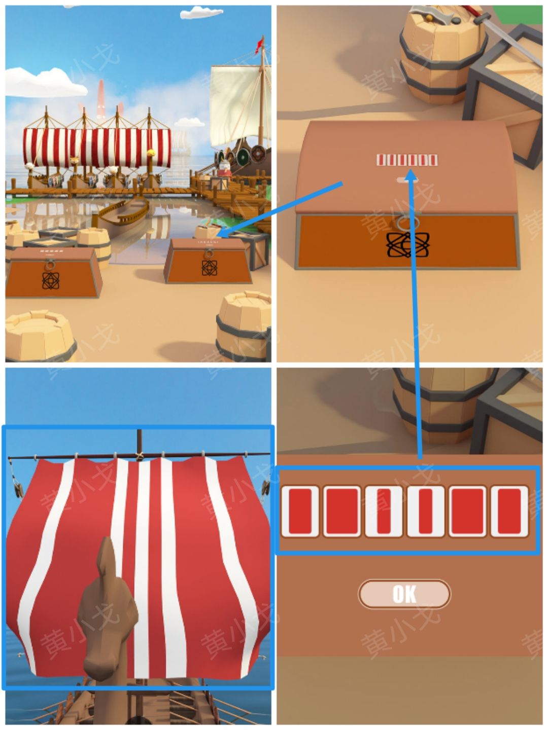 19.点击木桥右侧箱子上的密码锁,根据船帆上的红色盒子大小线索,调整密码锁