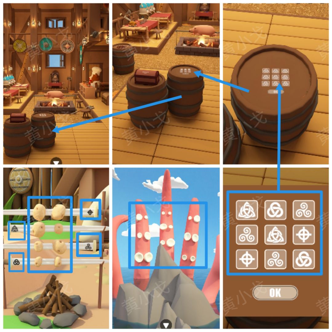 21.点击右侧木桶上的密码锁,根据[渡口]场景章鱼触角上的图案线索,结合[图腾]场景剑上的图案及土豆大小线索,调整密码锁