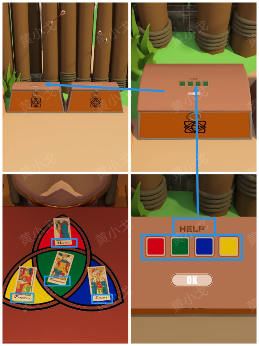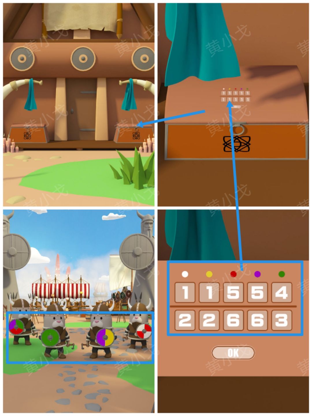 8.点击屋子外边右侧箱子上的密码锁,根据上面的颜色提示,结合[渡口]士兵拿着的盾牌上的线索,调整密码锁