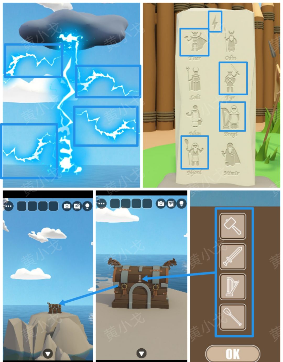 25.点击宝箱上的密码锁,根据闪电线索,结合[屋子]场景石碑上的线索,调整密码锁,打开宝箱