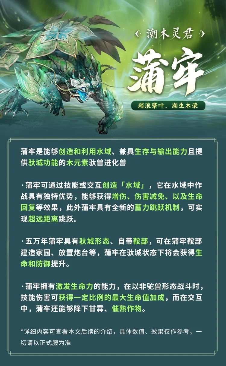 蒲牢传承了来自母亲的通晓地脉之力,因此能够激发自然的生命力。受青木能量滋润,技能伤害获得5%的最大生命值加成(驮兽形态无效)。