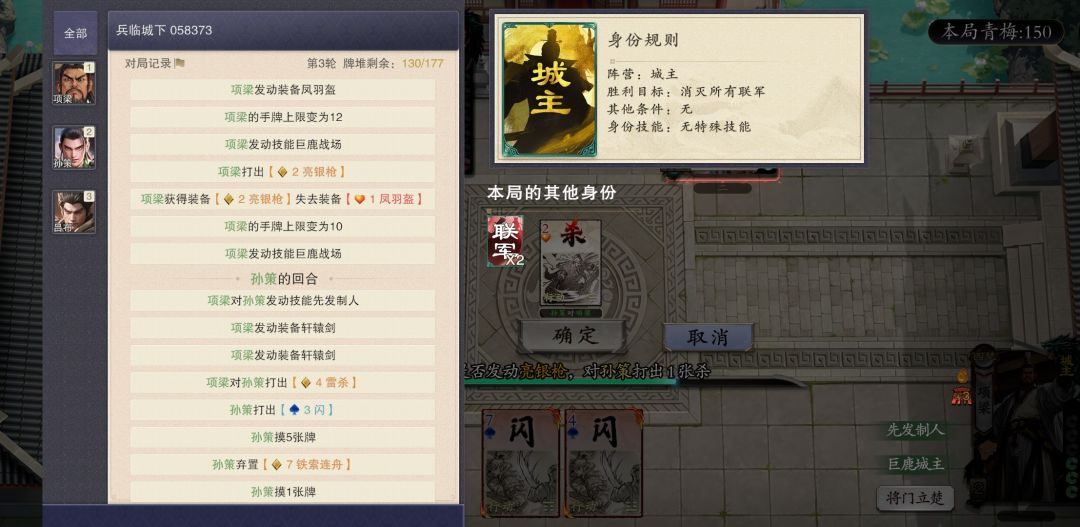 接下来是封面那个图:首先项梁装备轩辕剑杀孙策孙策技能封禁后,可以看到孙策没有发动技能但是多摸了3张牌。