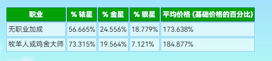 除了技能描述中提到的能更快与对应动物交朋友(抚摸时 +30 友谊而不是基础 +15)以及孵化时间减半或增加绵羊的羊毛产量之外,牧羊人和鸡舍大师职业还有一个隐藏的特性没有在游戏中提到。这个技能将增加 0.333 用于计算与技能对应动物类型的产品品质的分数。这导致铱星产品的频率明显提高。为了说明,下表显示了具有最高友谊(1000,即 5 颗心)和最高情绪(255)的动物在有和没有牧羊人/鸡舍大师技能的情况下铱、金和银产品的平均频率:
