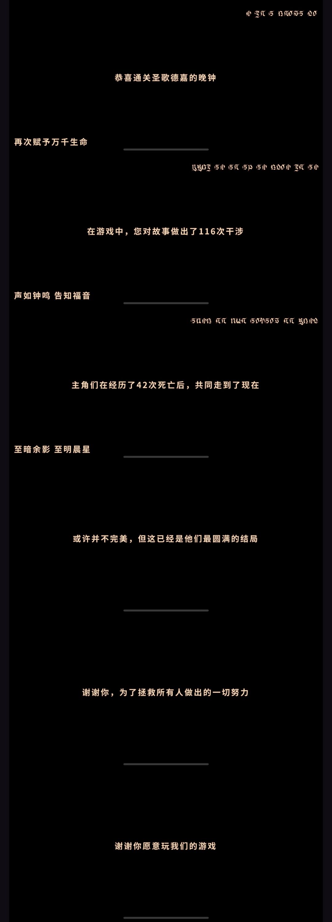 有的人为了自己的信仰 有的人为了探寻一个真相 有的人为了守护重要的人 而有的人只是为了想要活下去 其实没有绝对的对错只是立场不同 圣歌德嘉的晚钟终于敲响 而我们也终于迎来了劫后余生