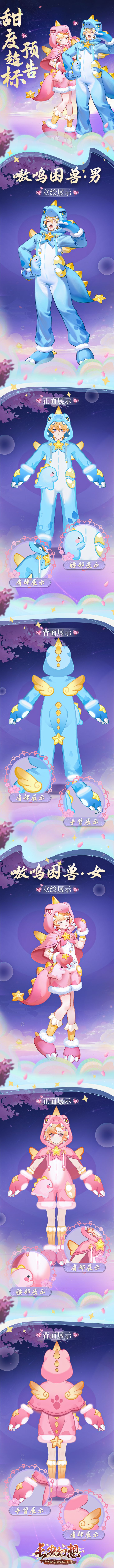 女装以粉色为基调,恐龙兜帽的小小披风守护着御灵师的美梦。以柔软睡衣为基底,樱粉色毛绒连帽包裹娇憨龙角,腰间束带缀有趴伏酣睡的刺绣小恐龙,裙摆处恐龙尾巴以星星绒布拼接,行走时绒尾自然摆动。
