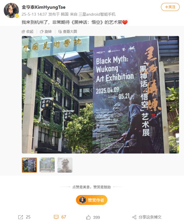 5 月 14 日消息,Shift Up 公司 CEO、《剑星》制作人金亨泰近日在围脖、盒子等各大平台开通账号并更新日常,例如他昨日前往杭州并参观了《黑神话:悟空》艺术展。