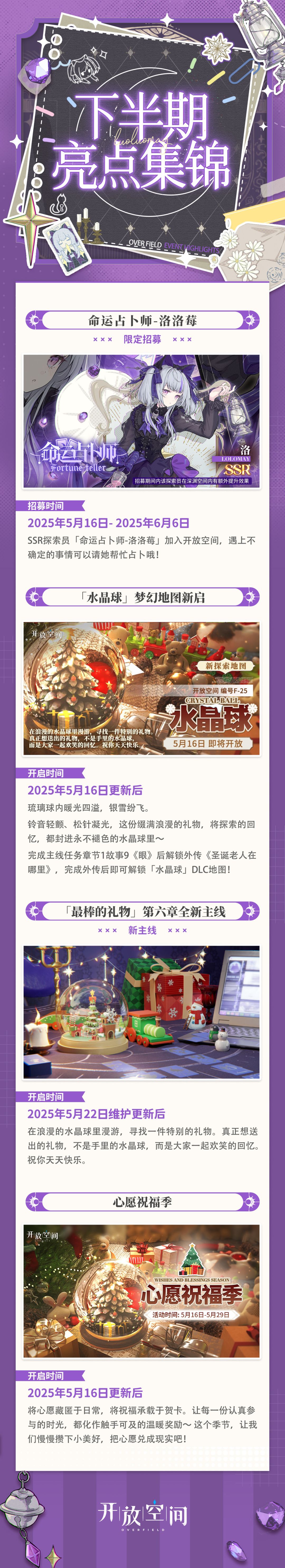 全新版本「祝你天天快乐」将在5月16日浪漫开启!新探索员命运占卜师-洛洛莓登场,梦幻的圣诞水晶球地图上线,版本活动《心愿祝福季》开启...