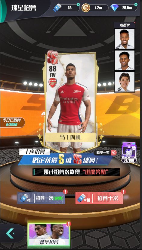 目前游戏中只有球星招募一种招募卡池,但在后续版本的更新中,我们会陆续新增卡池,每个卡池中球员评分也更不相同,玩家可以选择自己想要抽的球员卡池。当玩家抽到球员后,S和SS球员会在球员通道中显示对应的颜色,然后在球员展示界面会展示出球员的国籍,球队等相关信息。