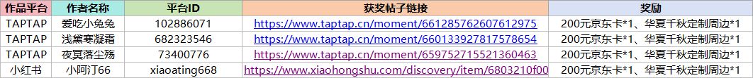4.获奖奖品【200元京东卡】将以电子码的形式发放;【华夏千秋定制周边】将以实体的形式发放;