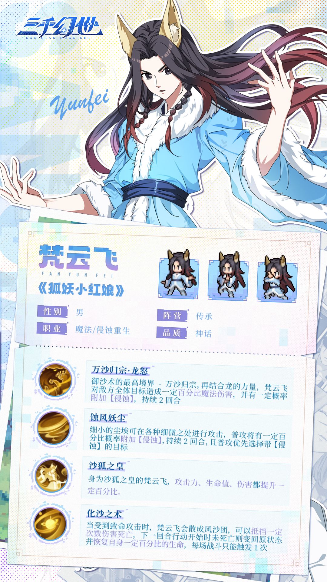 梵云飞,西西域第一高手。在三千幻世中也是一名实力非常强劲的英雄,技能为敌方全体造成大量伤害的同时还能够为其附加一定的负面效果。自身技能能够复活,有着很强的持续输出与续航能力。是三系中少有的有着特殊技能的英雄。