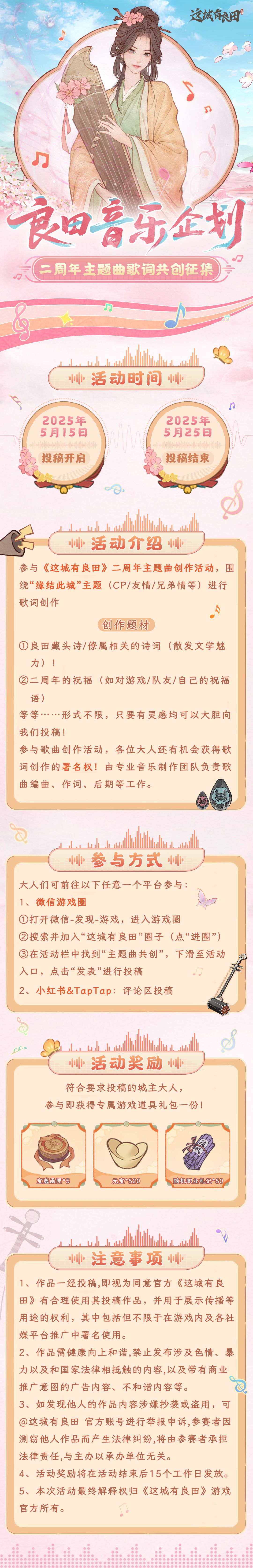 良田两载,有幸与各位城主大人相识相知,为庆祝《这城有良田》二周年庆典的到来,我们将开启“良田音乐企划”!现邀请大人们一同来参与周年庆主题曲歌词共创活动!