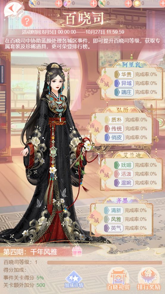 在百晓司中协助蓝颜处理各城区事件,即可提升百晓司等级,获得专属套装及珍稀道具,更可荣登排行榜。