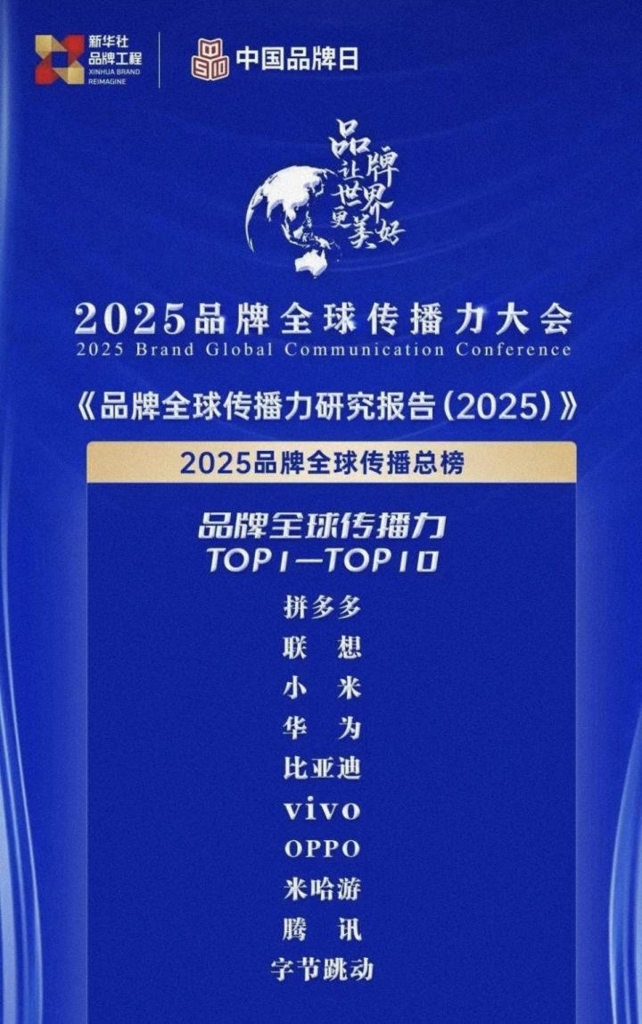 报告发布了2025品牌全球传播力综合榜单。数据显示,通信电子企业在中国品牌出海中占据主导地位,成为中国品牌全球化进程的核心力量。在品牌全球传播力综合榜前十位的品牌中,通信、消费电子品牌超半数,且排名均较2024年有所上升,其次为跨境电商、汽车、游戏等多个领域的突出品牌。