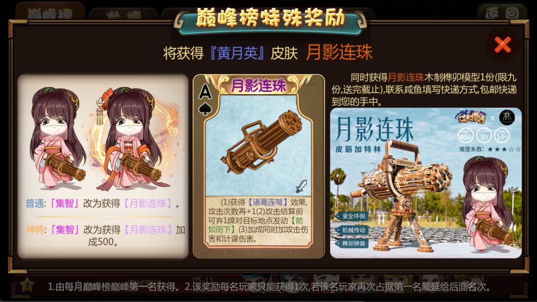 这次巅峰特殊奖励,专门联系工作室做了”月影连珠“的实体木制榫卯模型(限9份),这个模型拼接好以后是可以发射皮筋的,放在家中做装饰也是十分好看的,获得奖励的玩家联系咸鱼,这边会包邮快递到手中。能拿到这个奖励的玩家一定也是《过关攒将》的铁粉了,也是游戏回馈玩家,感谢对游戏长期的支持。