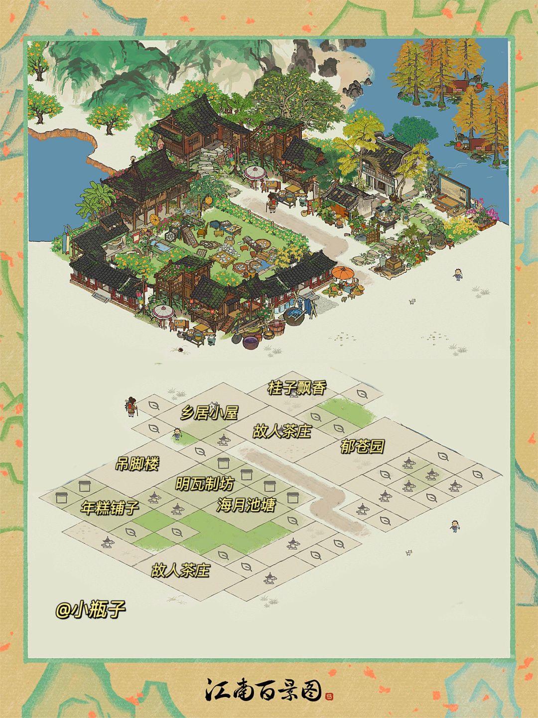 主要建筑:桂子飘香|乡居小屋|故人茶庄|郁苍园|吊脚楼|明瓦制坊|年糕铺子|海月池塘 |故人茶庄