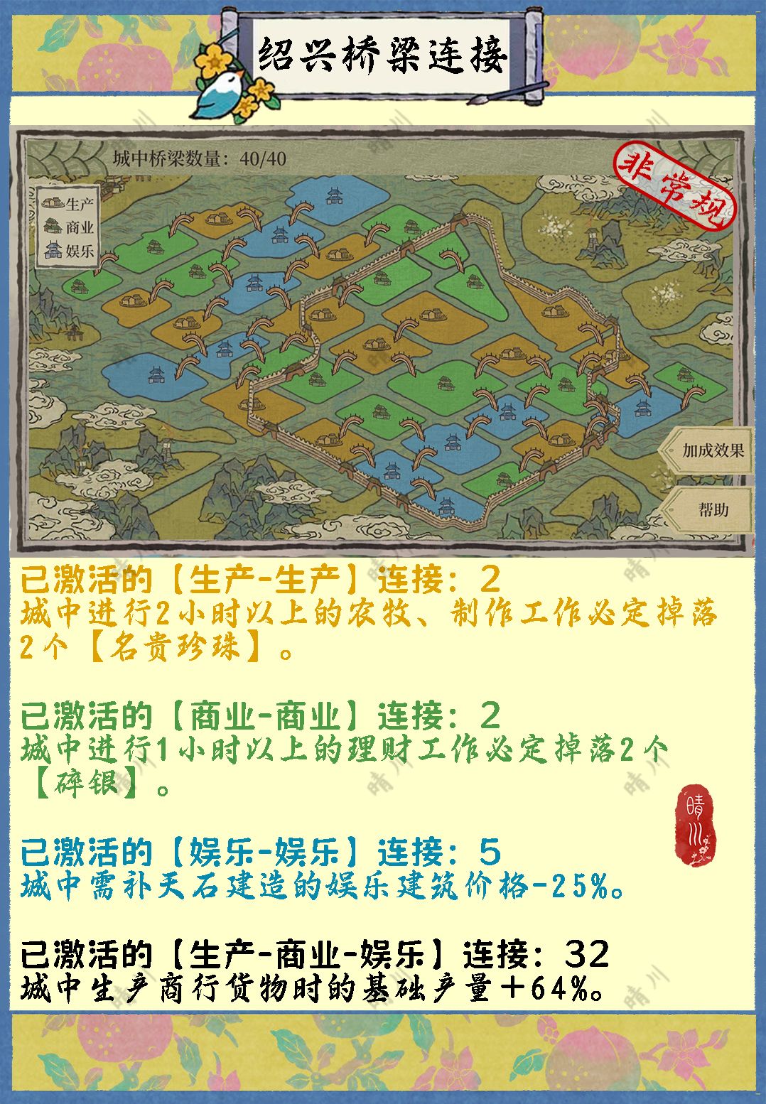 3. 桥梁连接并不存在所谓“最优解”,但各项加成之和存在确定的最大值:这个值为41。若城市四项加成效果之和达到该值,则说明加成效果达到最大,已无提升空间。