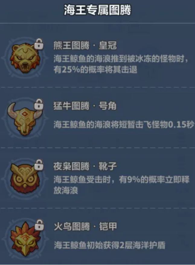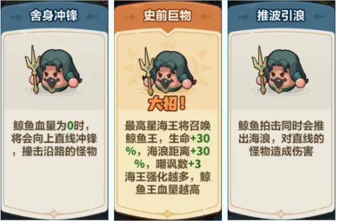 【史前巨物(大招)】:最高星海王将召唤鲸鱼王,鲸鱼王生命值+30%,海浪距离+30%,嘲讽数+3。海王强化越多,鲸鱼王血量越高。