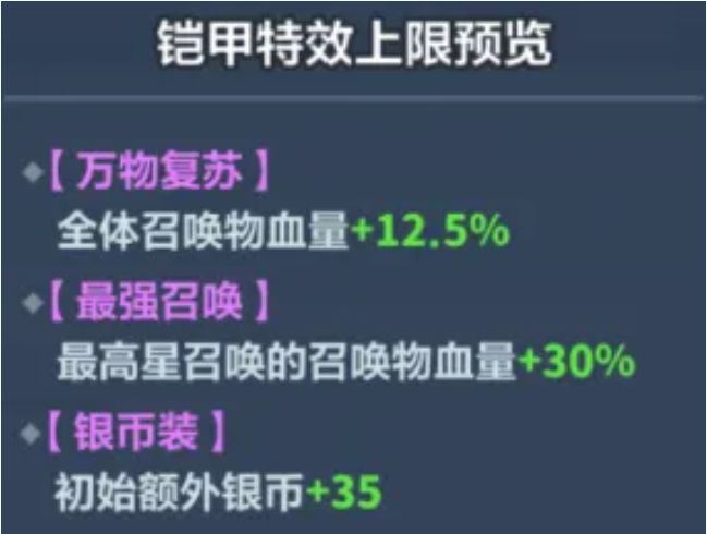靴子、铠甲部位可洗炼出召唤职业的专属特效。推荐的装备特效如下图所示:选择【召唤物增益】、【银币装】。