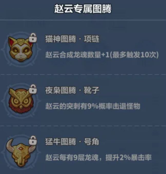 · 赵云的专属图腾效果全面,皆是赵云较为刚需的提升属性。「猫神」、「猛牛」图腾,让赵云更快捷叠加龙魂层数,配合暴击率带来的输出增益,大幅提高输出能力。凭借战士自身的高频攻击,来触发「夜枭」图腾的击退怪物效果,有效阻挡怪物进攻~