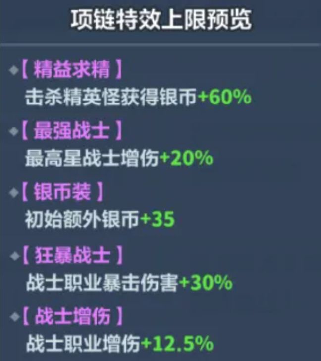 · 战士职业的专属特效可在项链部位洗炼而出。推荐特效如下图所示:选择【银币增加类】、【战士增益类】皆可~