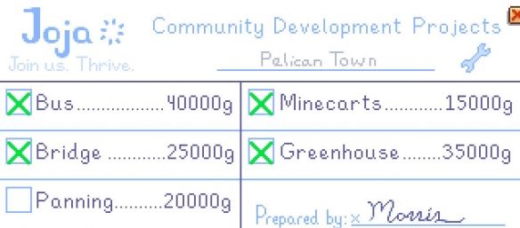 joja超市路线则是在超市花5000金加入会员,再花135000购买所有的社区发展项目即可。购买后,社区中心将变为Joja中心。