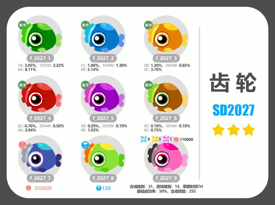 齿轮是三刀族3星鱼,一共9种颜色,其中前6色出处在关卡,第7色是贝壳鱼,第8色是珍珠鱼,第9色是合成鱼。活动时间为2025年5月15日至2025年6月1日,更新时间为2025年5月15日中午1点左右(更新时间以实际情况为准),更新后会重置捉鱼次数。