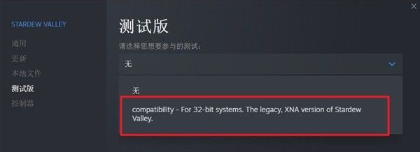 对于普通玩家,楼主强烈推荐升级至最新版本。如果只玩原版游戏,不打Mod,但由于系统限制只能游玩32位版本的《星露谷物语》的吧友,可以打开Steam,右键点击星露谷>属性>测试版,选择下图所示红框内容,这样游戏依然是32位并可以正常运行。