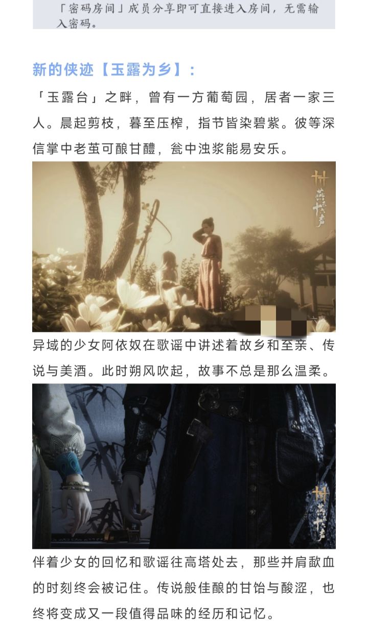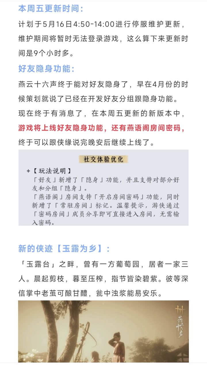 燕云十六声好友隐身功能,燕语阁房间密码,本周五更新10个小时,月卡奖励升级。新增侠迹【玉露为乡】