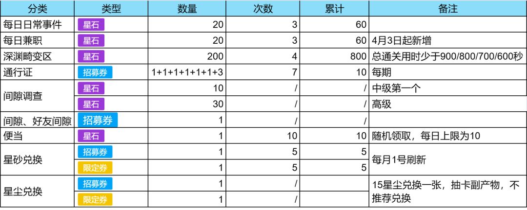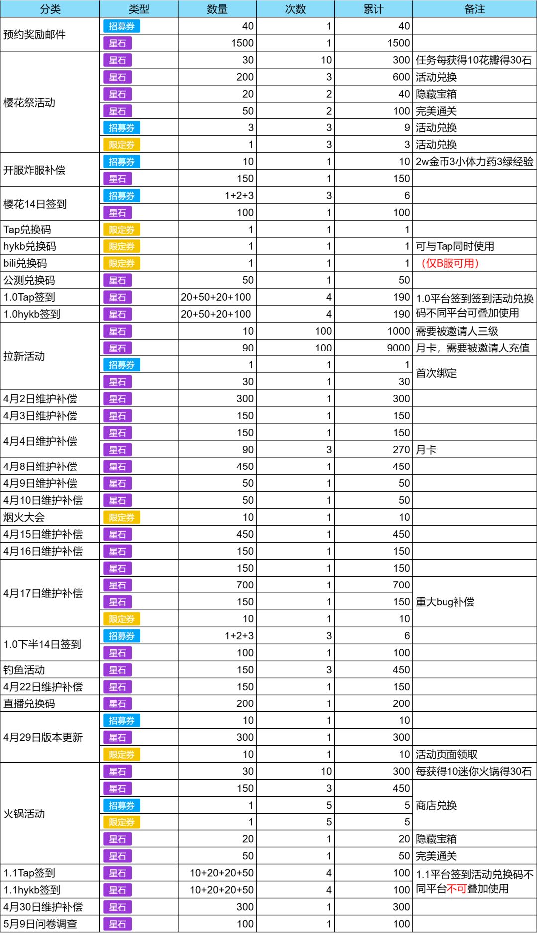 包括活动、维护补偿等等。不考虑拉新活动总共8790星石、87招募券、40限定券。