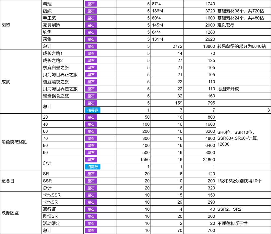 包括图鉴、映像图鉴、成就、角色突破奖励、纪念日。比较容易获得的部分大概只有角色突破12000星石+图鉴6840星石+纪念日300星石左右+成就560星石左右+映像图鉴600左右=20300星石,这里已经有差不多135抽了,成就的招募券正常玩家也基本能拿到3~4张左右。