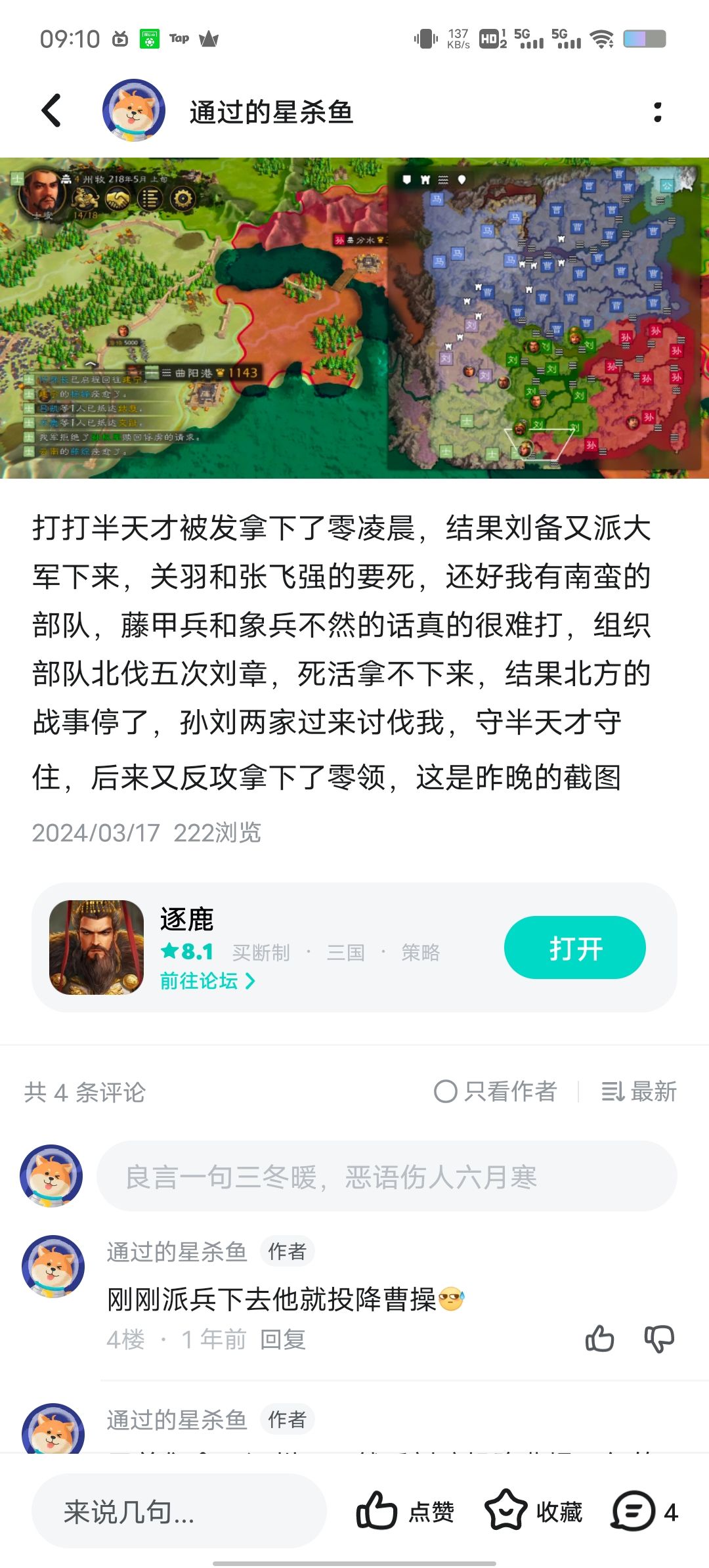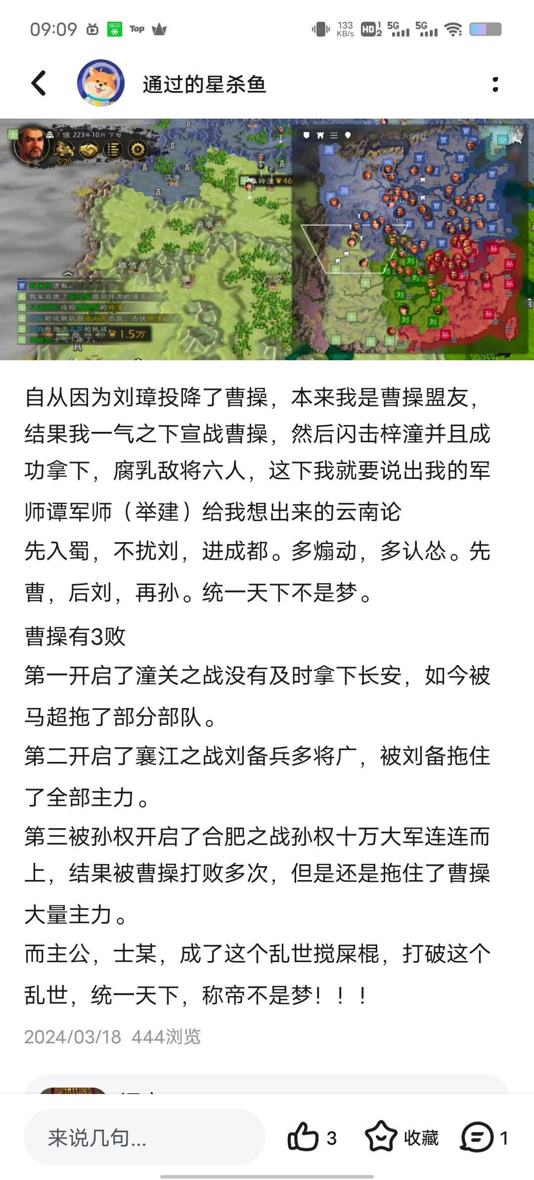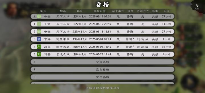这个这个档是这游戏刚出的时候我买了玩的时候也是陆续断断续续的,因为要考试,也是个学生,也没有很多时间精力去玩,最开始的时候选剧本的时候又不想太强,又想一个刚刚好的又很弱的,然后我就看到三分天下的广州王了,最开始的时候人手很少在广州那个地区,没兵没人,我就迅速的组织轻骑兵去云南地区,占领了建宁,南蛮,还有云南(这是广州王破局的关键)后来我就开始登庸,人手真的很少登庸真的很难成功,陆续在游戏里发展了差不多好久(游戏时长5小时)才基本有了充足的人手,在这期间只要看到特别厉害的人,我就给他拿下放到广州地区扛住孙权的进攻(孙权不知道在想什么,一直打我)这防守期间我想了很多办法,首先抛弃掉比较远的苍梧,然后在桥头堡附近建城墙,放陷阱,放弓箭塔,无所不用其极,只为防守,后来不知道为什么刘备也欠,和孙权一起攻打我那时候真的想直接放弃,当时就开始死守,基本有什么阴招都用上了,后来趁着刘备人不够反攻过去拿下了零陵,结果刘备一个大军下来我就守不住了,果断抛弃,想办法破局,后来就开始死守了一段时间,然后刘备和孙权都不来打我了,我就放了一对象兵和几个70武力来守城,只要有人来就卡着关口,卡着那个城墙不让他们过来拖时间,然后我就开始在建宁地区使劲组织兵力,把我有强度的主力全派了过去,为了保险起见,我还双开存档,求稳,攻打江州失败了整整5次,他们的兵真的太多了,只要他们的人及时来到城下,我就打不过了,然后中间我就弃坑了一个月,后面突然想玩的时候又发现了解决方法,我准备的时间久一点不就得了,然后我就准备了很久,然后准备了很多兵力,然后又派一些中等部队前往卡住那些支援的人,尽量能拖时间就拖时间,后来也是夺下了江州,后来我发现刘漳因为把部队调过来防守很多地区兵力其实也不是很多,我就立刻开始组织起来,先把部队放到他的边境那里,然后吸引他的部队出来然后打败(刘璋他手下的人其实强度都不高,甚至可以说就没几个能用的)打起来也是很艰难,后面也是支援了很多部队过来,一路平推准备到成都的时候他投降了曹操。。。。。。你们知道我有多崩溃吗?那时候我和曹操还是盟友的关系,然后我就急了,想办法解决结果发现不管怎么样都会投降曹操,只要一出兵就投降,后来我就想到方法了,直接给曹操宣战了不就得了,因为我发现当时曹操的主力部队都和马超在打,长安地区的战况特别激烈,刘备和孙权也没时间管我,因为他们俩的部队也在打曹操后续看了二贴