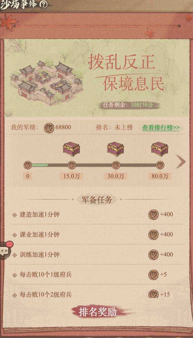 需击败约15-20万府兵才能获得满分200万积分,强烈建议与其他玩家友好互刷,这样既能完成沙场争锋,又能推进州对决任务。