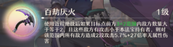 (等级1):使用近程绝技后如果目标点前方3x2范围内敌方数量大于等于2,且这些敌方有攻击小于本法宝持有者,则对该范围内所有敌方造成2段攻击5.7%+27倍率无属性伤害