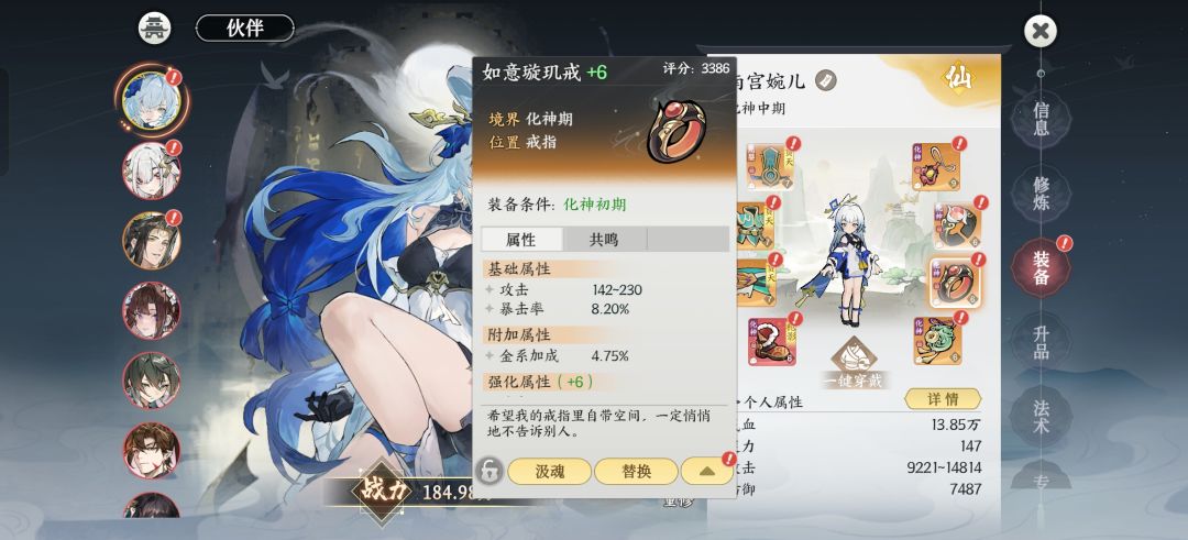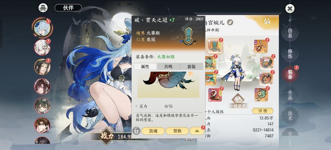 伙伴搭配 我用的是婉儿 月曦 惊尘 惊尘的主要作用就是加一个爆伤 和金属性伤害 另外有些层数怪物不吃消血概率 这时候就需要婉儿补充一个输出 婉儿的爆发和输出都不错 但是就是严重缺蓝 因此 婉儿的装备最好能带3件惯天 提高灵力恢复 另外伙伴装备上还有金系加成和符系加成这个有的也可以换上 还有附魂也可以打上两个最大灵 提高婉儿的输出
