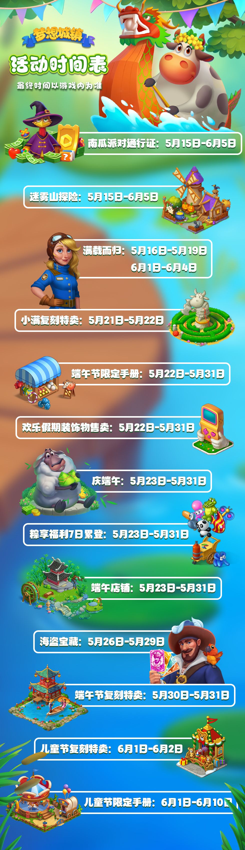【梦想城镇】1230版本活动表新鲜出炉咯,请大家参考喔,最终活动安排请以游戏内时间为准喲。另外本次端午将至,团队上线了“专属国风装饰物”别有一番诗情画意,喜欢就行动起来吧,为TA们找一处合适土地建造起来吧!