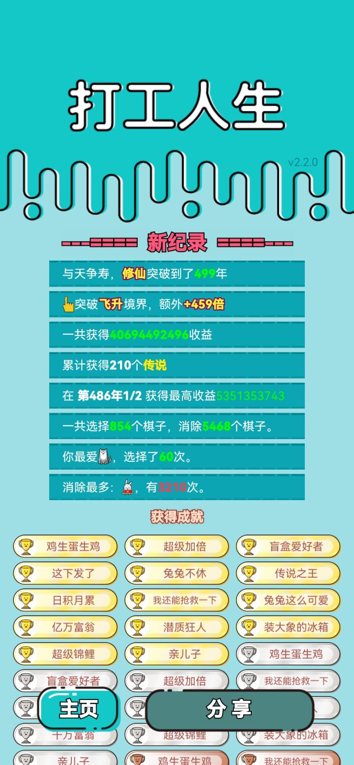 我打工坚持了499年。共获得40694492496收益。累计获得210个传说棋子。共选择854个棋子,消除5468个棋子。我最爱狼,选择了60次。获得了37个成就!