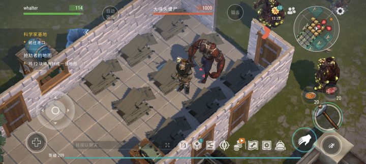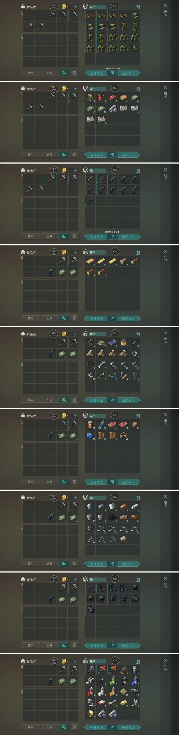 1c4,6石斧以上,外面的那个箱子空的,皮卡也是空的,工作台忘了开。9个箱子从左上到右下排列,没有刺,但还挺肥的。忘了截布局图,被大块头打了两下