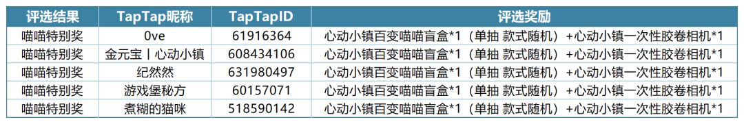 【喵喵特别奖】活动结束后,喵喵将会根据攻略发帖数量、质量、互动量等维度综合评选出5位作者,作者可获得心动小镇百变喵喵盲盒*1(单抽 款式随机)+心动小镇一次性胶卷相机*1。