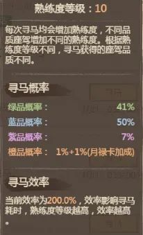 (二) 寻马熟练度与概率每次寻马均会增加寻马的熟练度,不同品质座驾增加不同的熟练度。熟练度等级越高,可提升寻马效率,产出高品质座驾的概率也会越高。寻马熟练度等级满级为10级,满级后有概率寻到橙马,寻马效率也提升至200%。注意:微氪玩家购买月禄卡可增加1%的橙马概率。满级后的寻马概率如下图