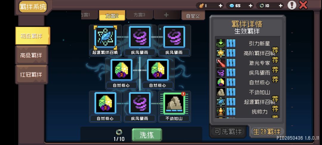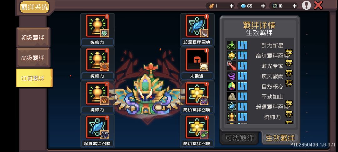 2. 起源羁绊召唤与高阶羁绊召唤,统率力 一定要洗在红冠羁绊页面 由于红冠只有八个孔位就会多出来一个位置 一定洗在初级羁绊页面如下图一(起源,高阶,统率力三选一。初级页面洗满后会空出一个位置刚好放多出来的那个羁绊)