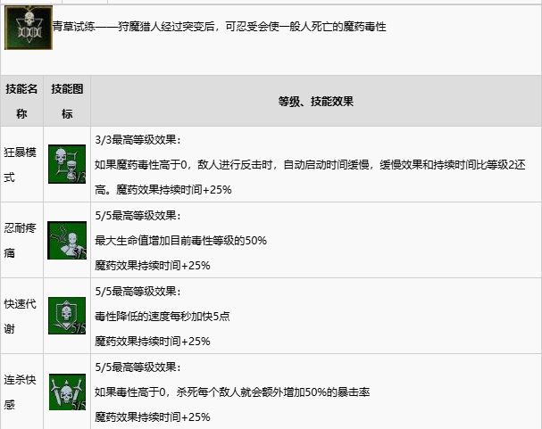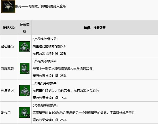 《巫师3:狂猎》这款游戏给了玩家很多很多选择,分别有炼金流、法印流以及剑术流供玩家选择,下面就为大家带来巫师3的炼金流的技能一览,包括技能效果以及习得等级,希望对各位玩家有所帮助。