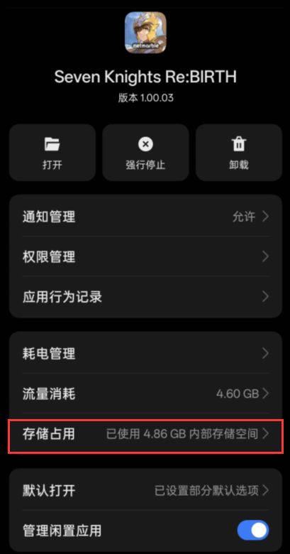 2、在跳转的页面中找到游戏的“存储空间”选项(每种机型的具体描述不同,但大体是一致的):