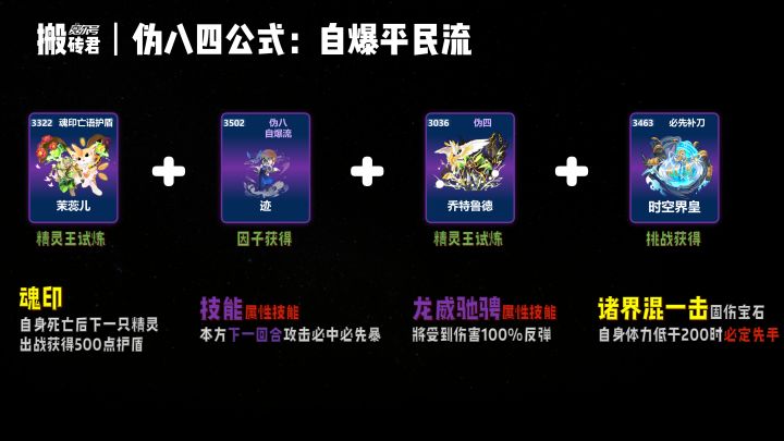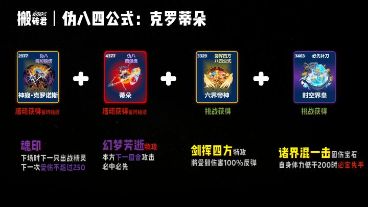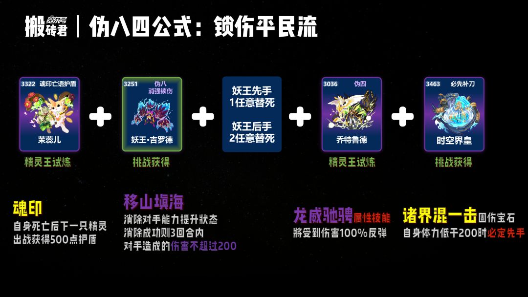 该阵容几乎可以完全平替真84:送克罗拿锁伤,蒂朵自爆提供必先,六界帝神利用必先弹伤,时空界皇必先技能补刀