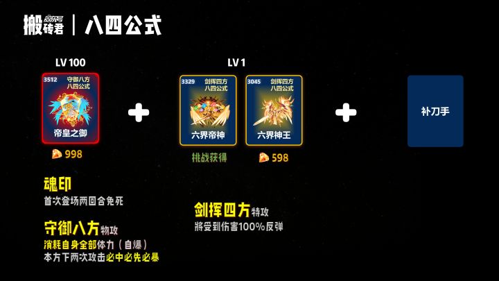 【八四公式】分为三个部分:帝皇之御利用魂印免死开出守御八方,获取两次必定先手权,接着1级的六界消耗1次必先释放剑挥四方弹伤,最后补刀手消耗第二次必先击杀对手。