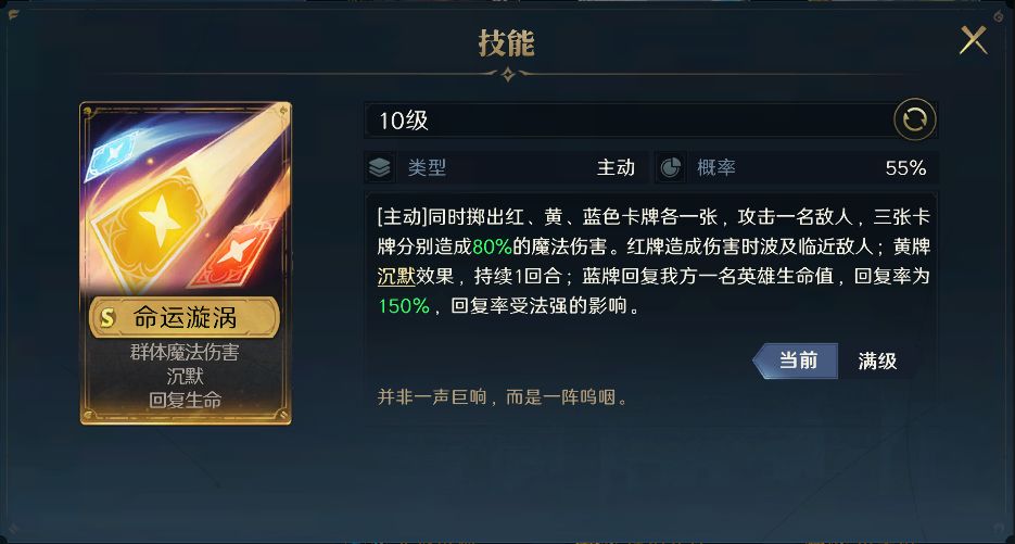 普攻:随机切换红/黄/蓝三色卡牌,红卡溅伤害、黄卡沉默一回合、蓝卡治疗系数提升至法强150%。