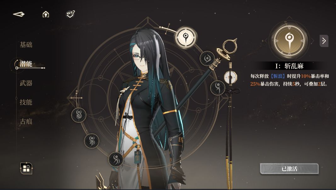 【潜能1】每次释放强化普攻【斩浪】提高10%暴击和25%暴击伤害,持续5秒,可叠加2层。